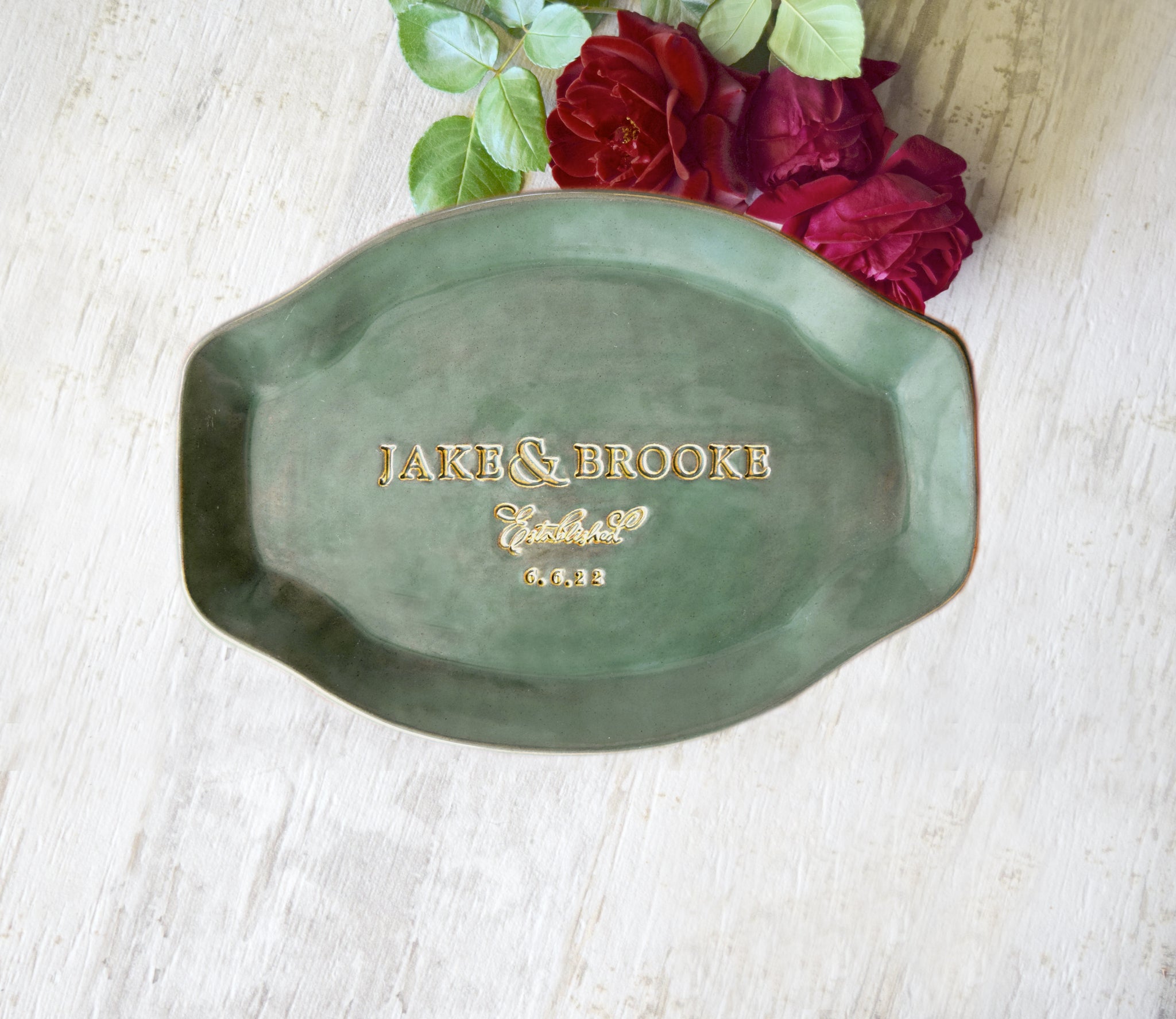 Each platter is handcrafted in the USA from natural ceramic clay and finished in a rustic gloss glaze with a golden-tinted rim, creating a timeless and one-of-a-kind heirloom. Whether used as a wedding gift, anniversary tray, or decor in the couple’s home, this piece is sure to be treasured for years to come.