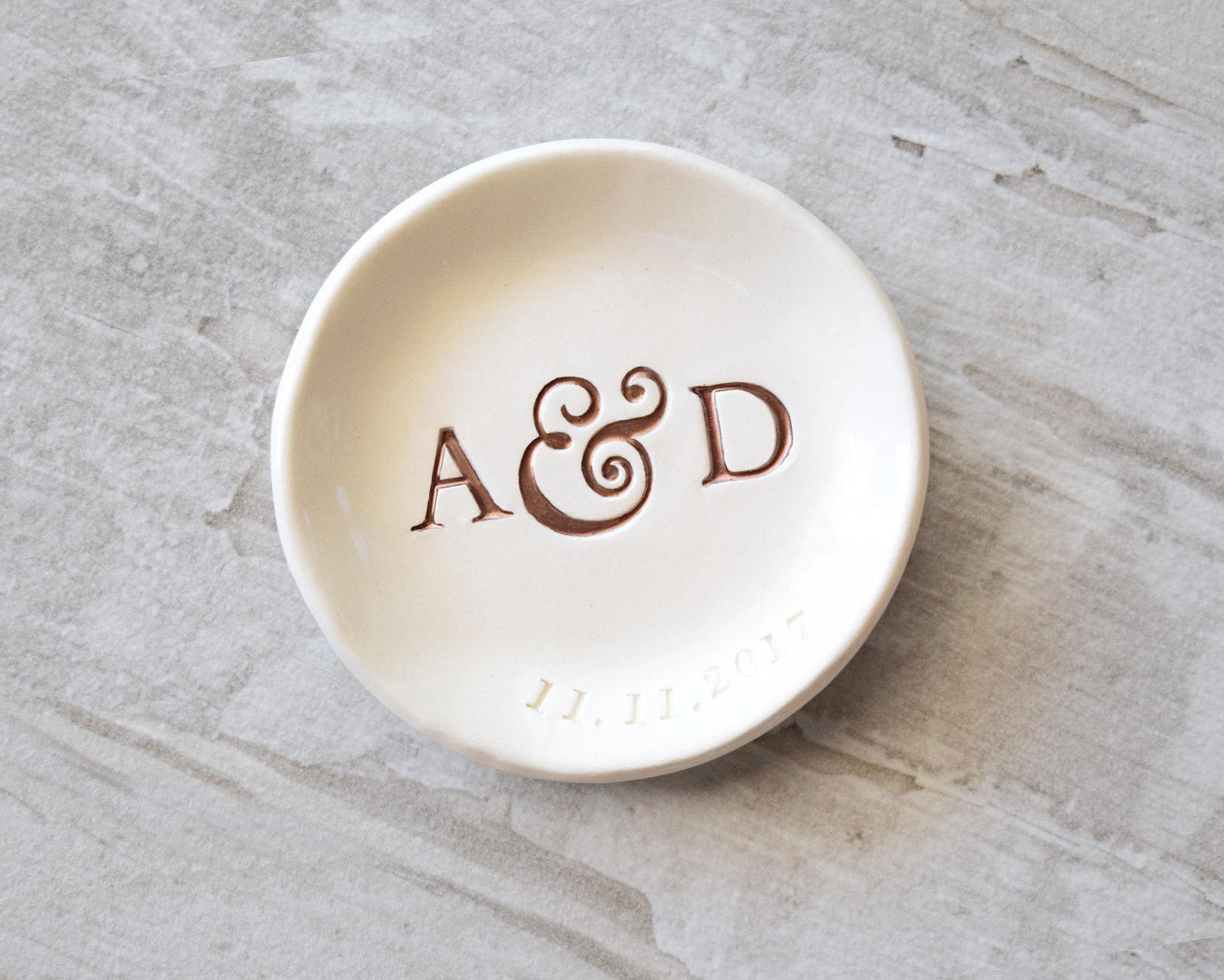 - Personalized custom pottery plate with engraved classic style 3 letter monogram & date is an attractive spot for the wedding rings, engagement ring & everyday items. This custom pottery ceramic ring plate is a thoughtful gift for the couple & will quickly become a cherished heirloom, used to hold their wedding rings and special belongings for years to come!