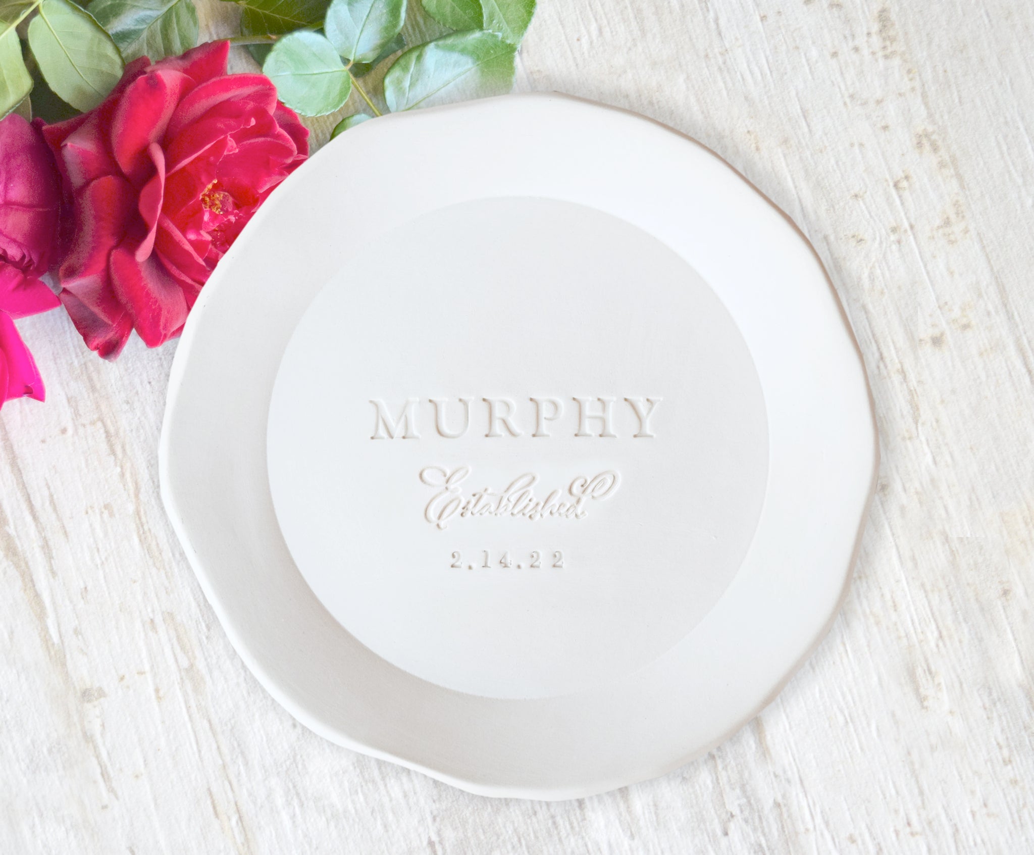 Each dish is created with their personalization stamped in clay: 2 first names or family last name, the optional word established and a date. This elegant serving dish doubles as both a meaningful keepsake and functional home decor.