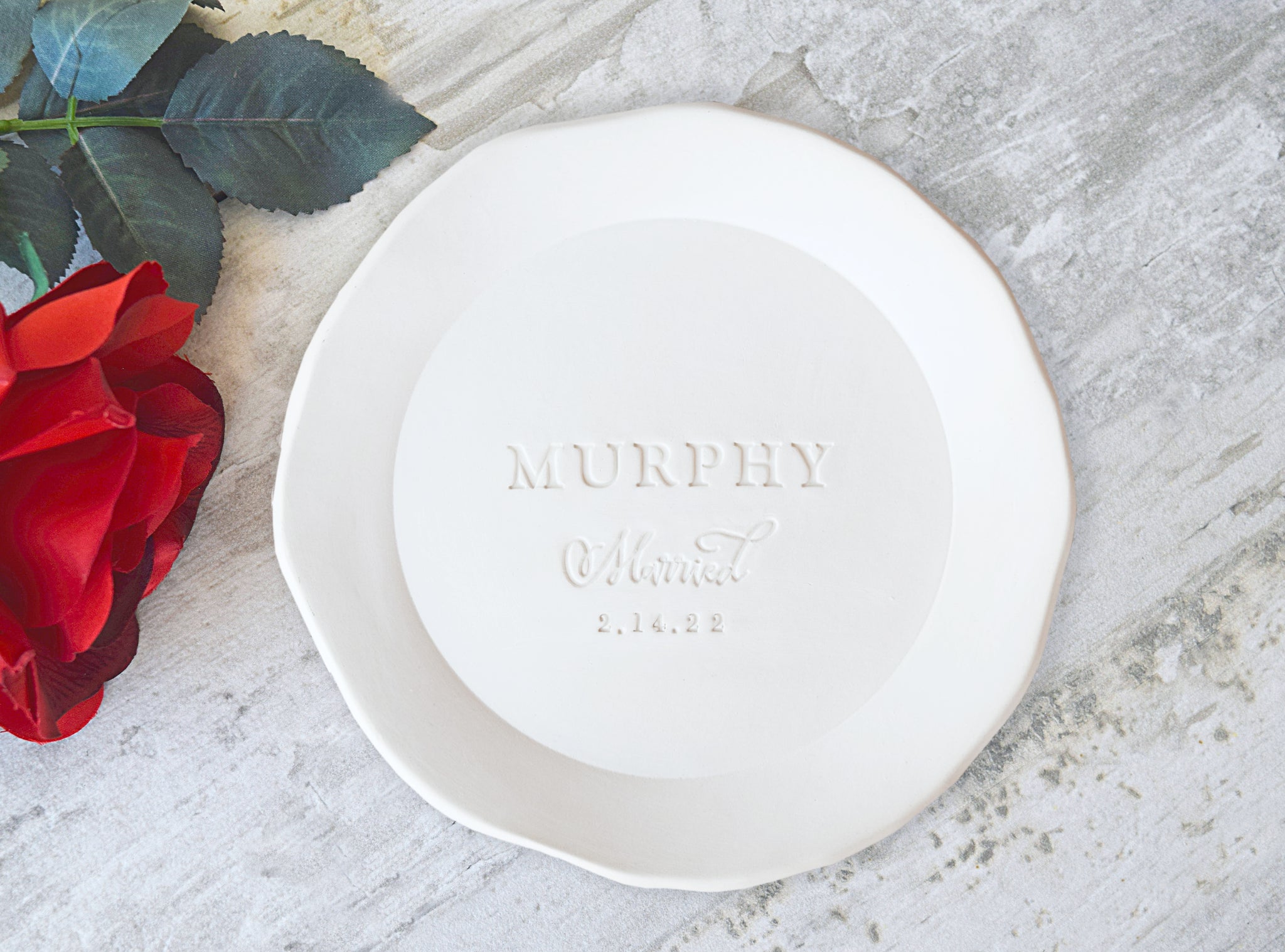 - Please enter your single last name or 2 initials and date as numbers. The word 'Married' in calligraphy is included. Please let us know if you do not want this feature on your dish. Computers are not used making your dish. Each dish is created entirely by hand. Minor variations that occur are part of the charm of hand-crafting. Each letter is individually positioned in the clay by hand, so minor variations must be expected.