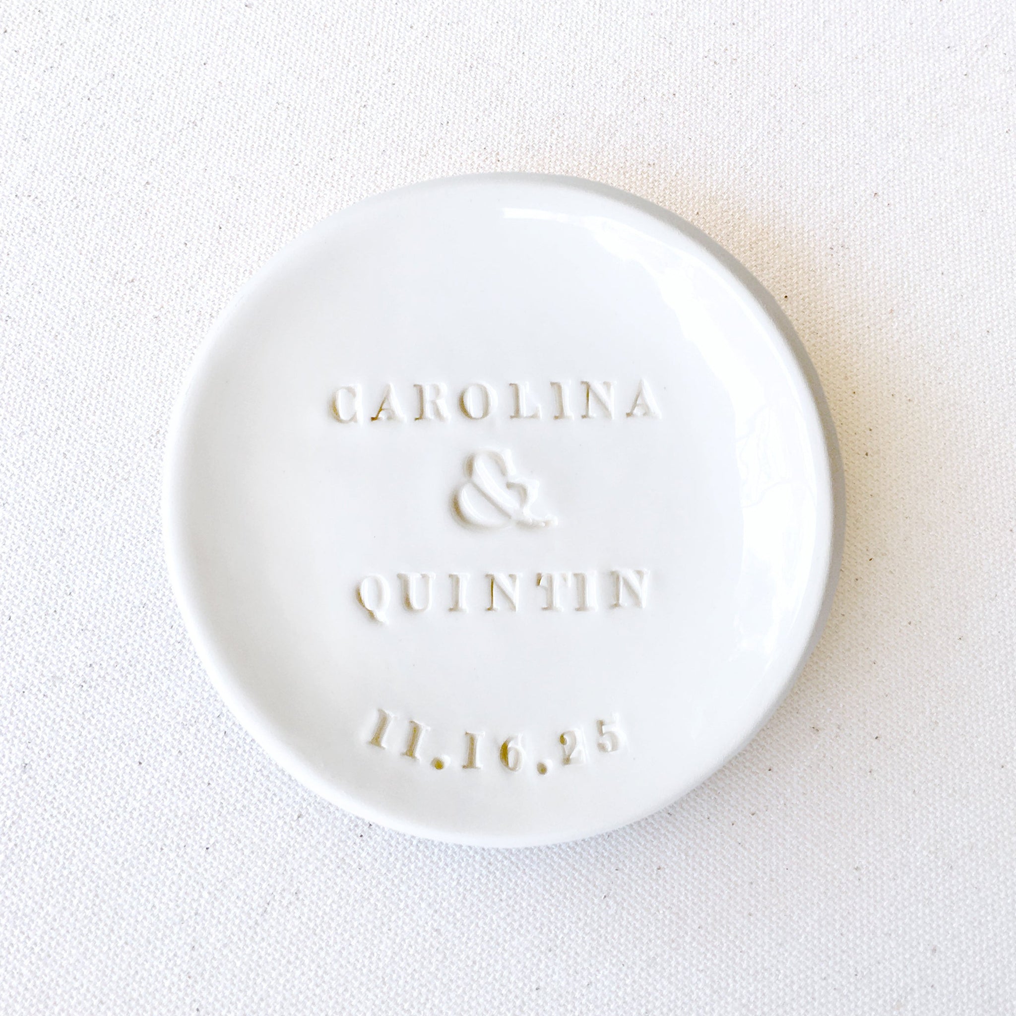 - Personalized Ring Holder Custom Ceramic Name Plate Made to order, your personalized ceramic ring dish will be created with your 2 names & date to celebrate any special occasion. This personalized jewelry holder makes an ideal wedding, bridal shower or a just because gift!