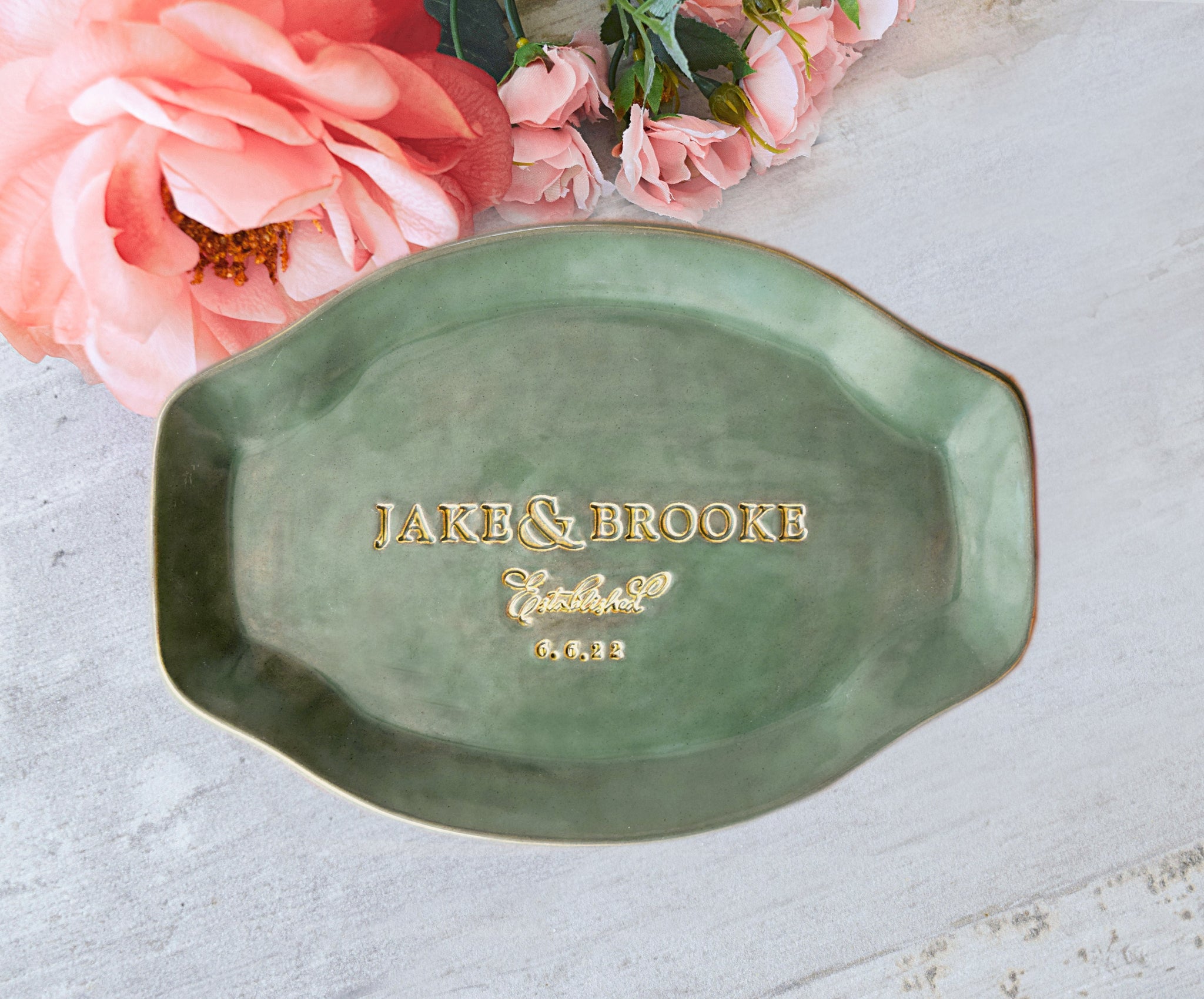 - Rustic Green Personalized ring dish custom pottery abstract square tray with gold trim name initials & date, a unique wedding gift for couple anniversary plate or engaged marriage proposal engagement gift for friends, partner, fiance, husband wife. Made to order, the green jade glaze turns golden brown over ridges & rim - no 2 are alike! Some dishes will appear more solid green & others will have a marbled effect.
