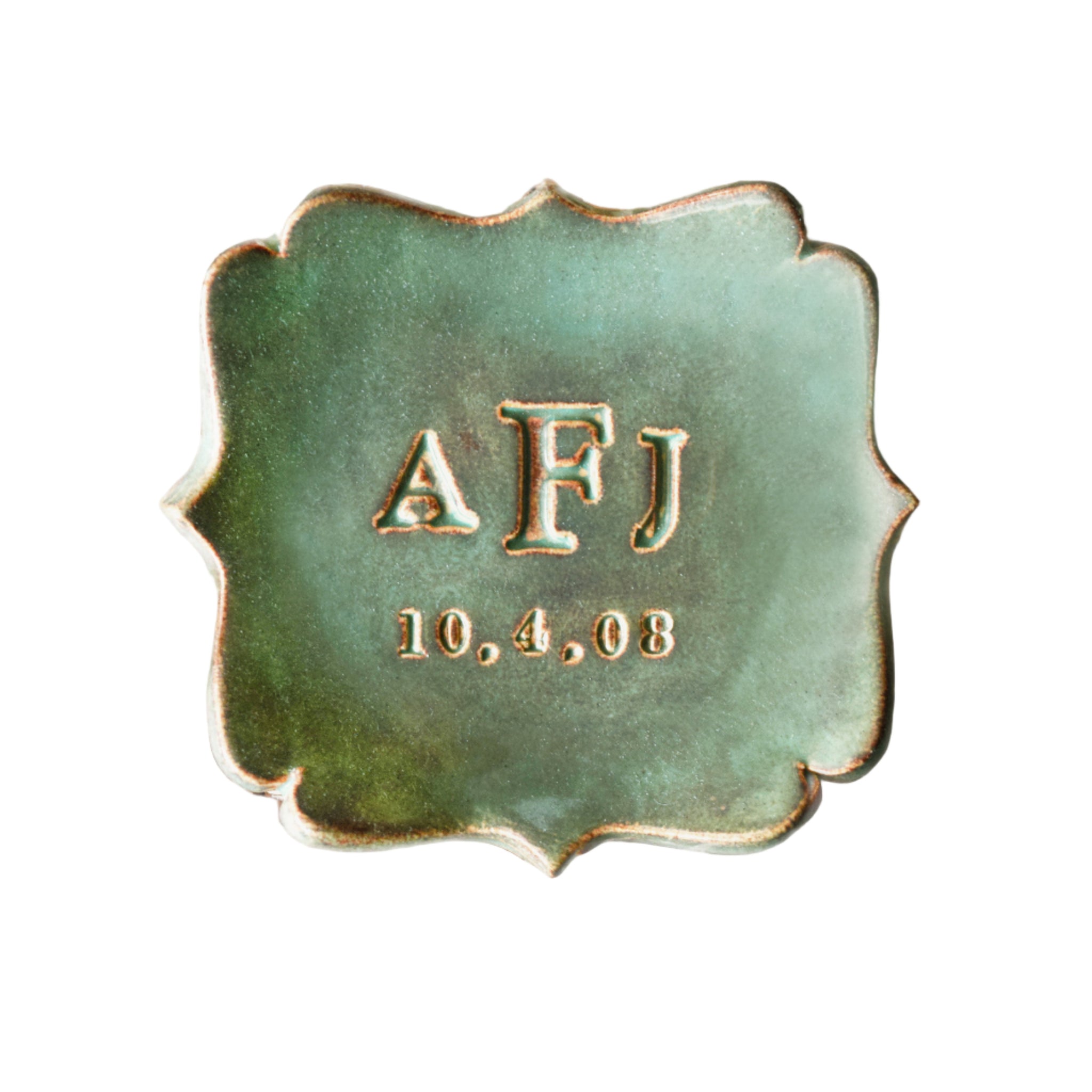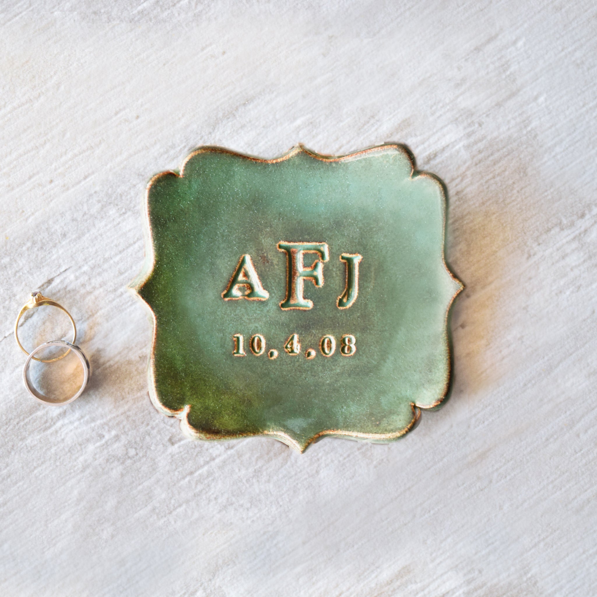 - Personalized custom pottery plate with engraved classic style 3 letter monogram & date is an attractive spot for the wedding rings, engagement ring & everyday items. This custom pottery ceramic ring plate is a thoughtful gift for the couple & will quickly become a cherished heirloom, used to hold their wedding rings and special belongings for years to come!