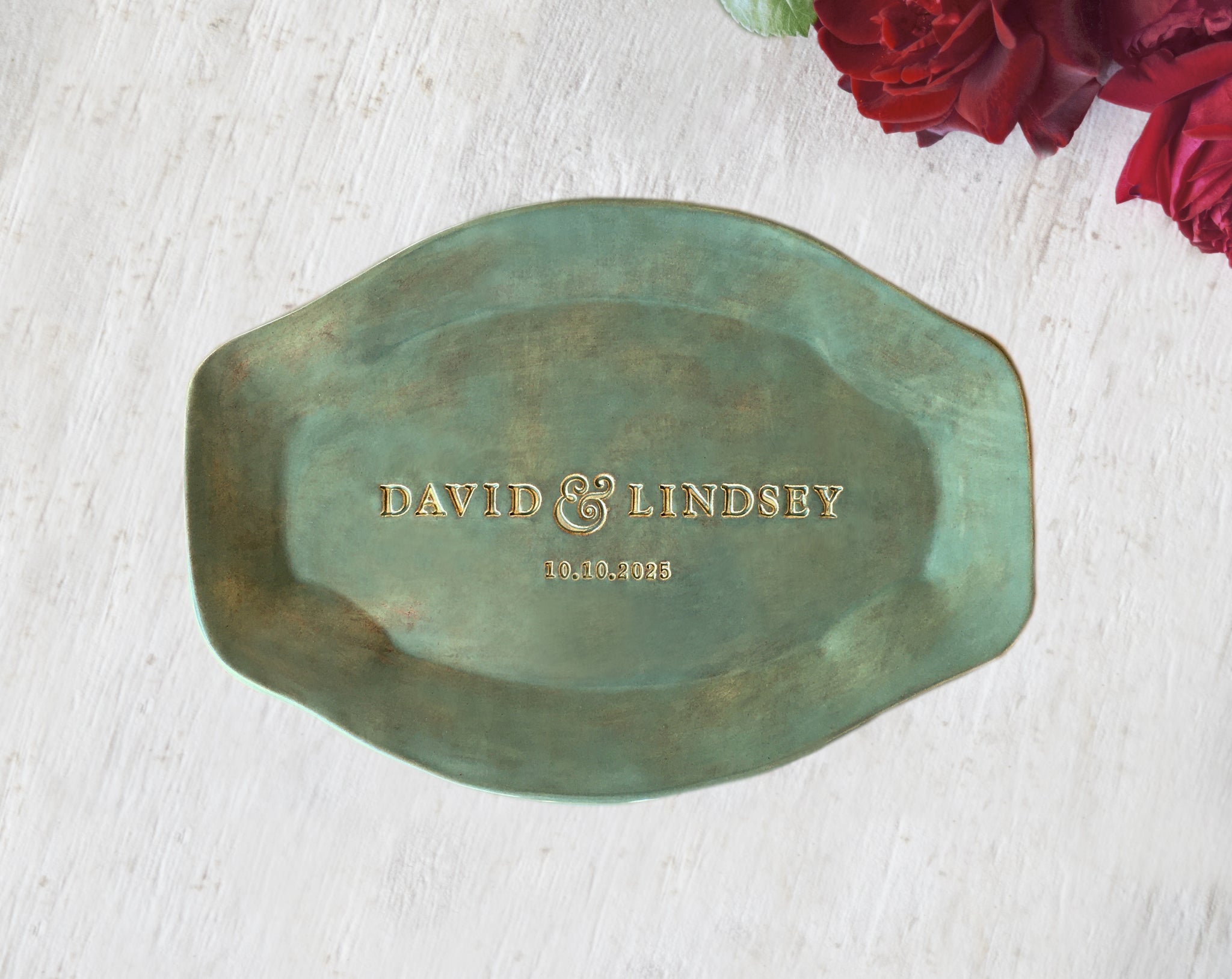 - Bring beauty and meaning to your table with this handcrafted ceramic serving platter, personalized with 2 first names or a family name & date. Glazed in a rustic glossy green hue with warm, earthy undertones, this functional art piece is perfect for both everyday meals and special gatherings.